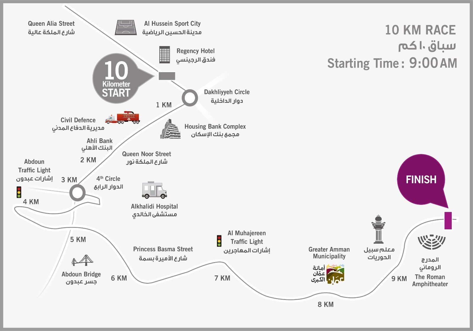 وبيّنت الجمعية أنه سيتم إغلاق الطريق الممتد من مجمع رغدان الجديد مروراً بشارع الجيش باتجاهيْه، والساحة الهاشمية وشارع قريش وشارع علي بن أبي طالب وصولاً إلى إشارات المهاجرين، مروراً بشارع عمر مطر وشارع الملك طلال وشارع الهاشمي، وذلك اعتباراً من الساعة الثانية عشرة بعد منتصف الليل وحتى الساعة الثانية عشرة ظهراً، ضمن مسار سباقي الـ42 كم (الفردي/التتابع) و21 كم.