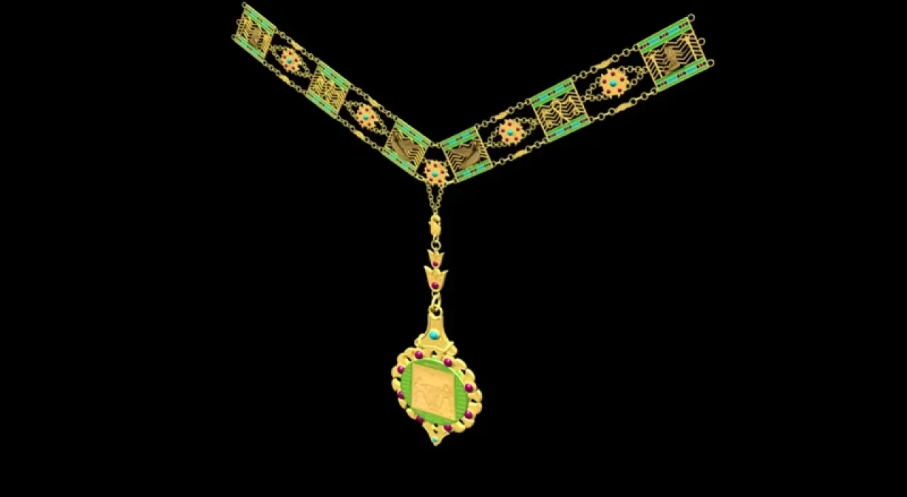 تتكوّن من وحدات مربعة مزخرفة بالمينا الملوّنة والرموز الفرعونية، تتصل ببعضها عبر سلسلتين متوازيتين تتخللهما زهور اللوتس، رمز النقاء والخلود في الحضارة المصرية.