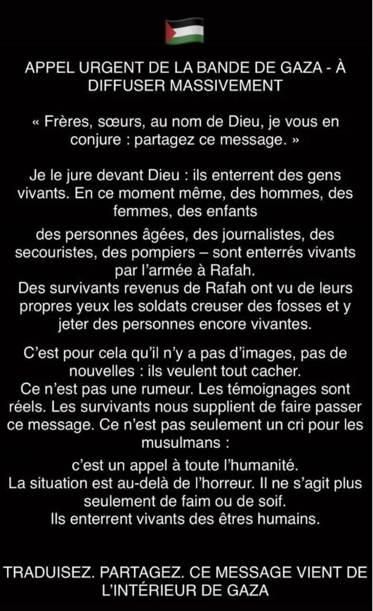 بل هو نداء للإنسانية جمعاء.. الوضع تجاوز حدود الرعب. لم يعد الأمر مجرد جوع أو عطش.. إنهم يدفنون البشر وهم أحياء.. ترجموا. شاركوا. هذه الرسالة من داخل غزة”.