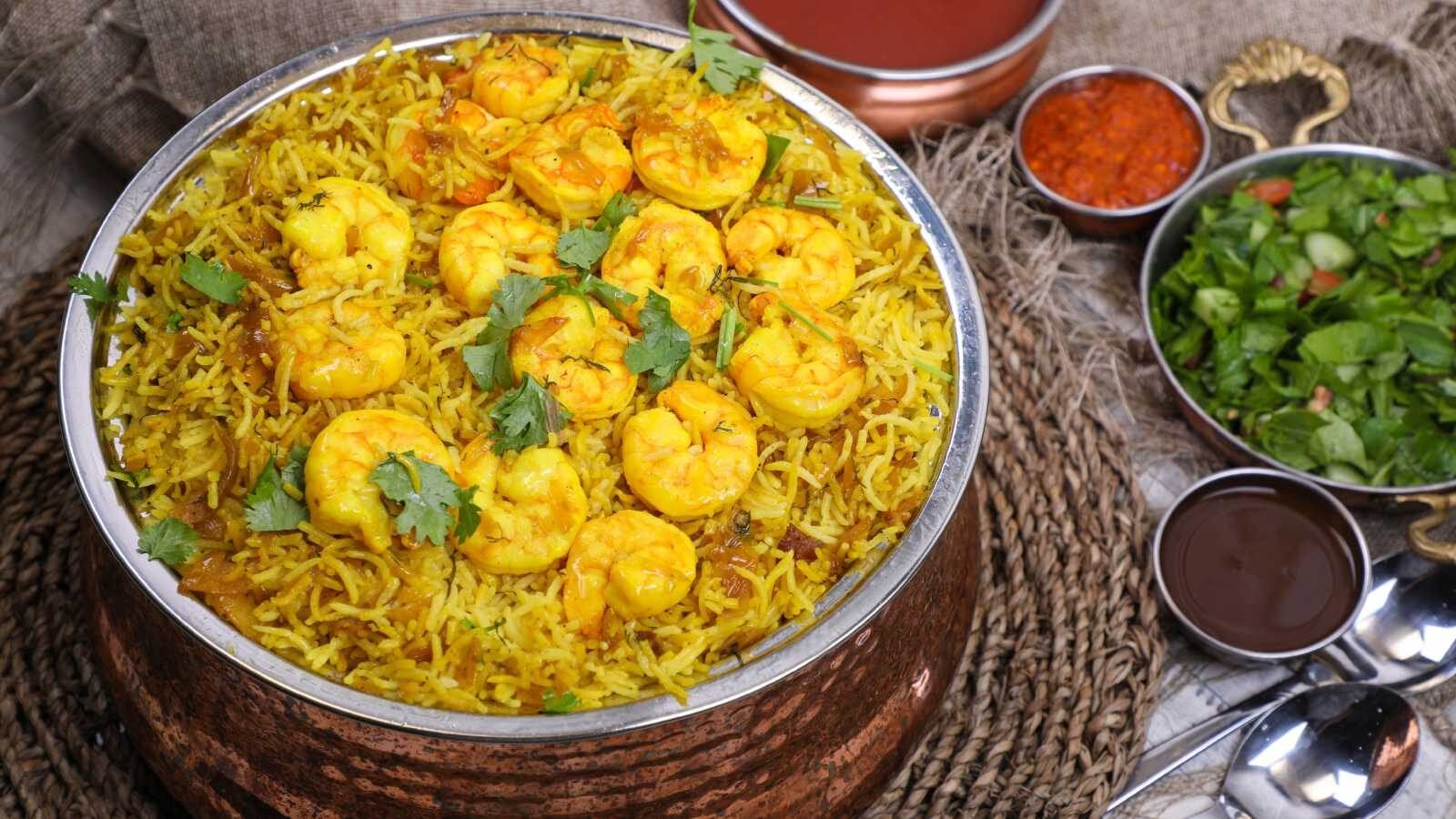 قدّمي مجبوس الجمبري ساخناً إلى جانب سلطة الزبادي أو الدقوس الخليجي الحار.