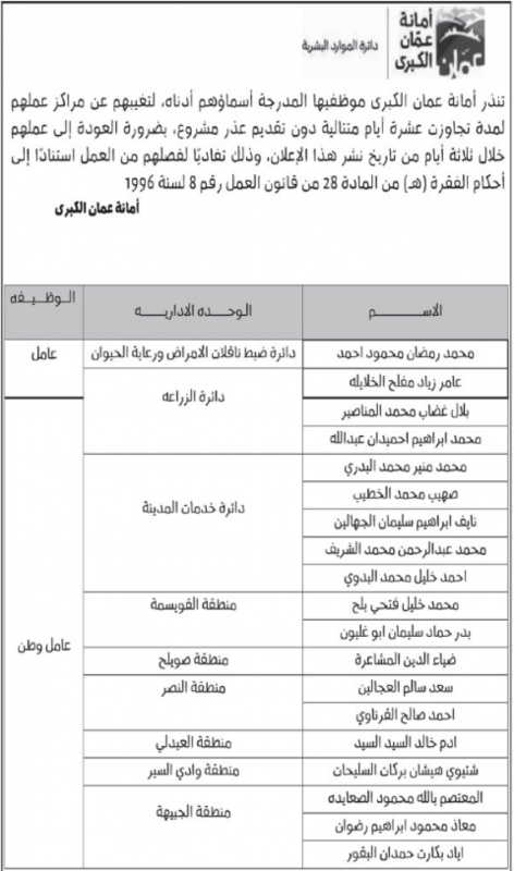 العموم نيوز: وجّهت أمانة عمان الكبرى إنذارات رسمية إلى 19 موظفًا بسبب تغيبهم المتواصل عن مراكز عملهم لأكثر من عشرة أيام متتالية دون تقديم أعذار مشروعة.